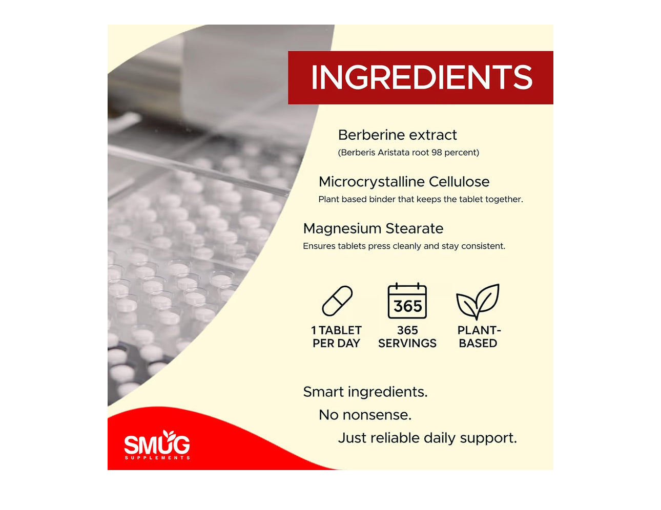 - BERBERINE FOR DAILY WELLBEING SUPPORT – SMUG Supplements Berberine is a one-a-day supplement designed for simple, everyday use as part of a balanced lifestyle and routine wellness.